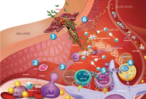 comienzan a curar la herida formando coágulos para cerrarla. Segunda respuesta inmunitaria